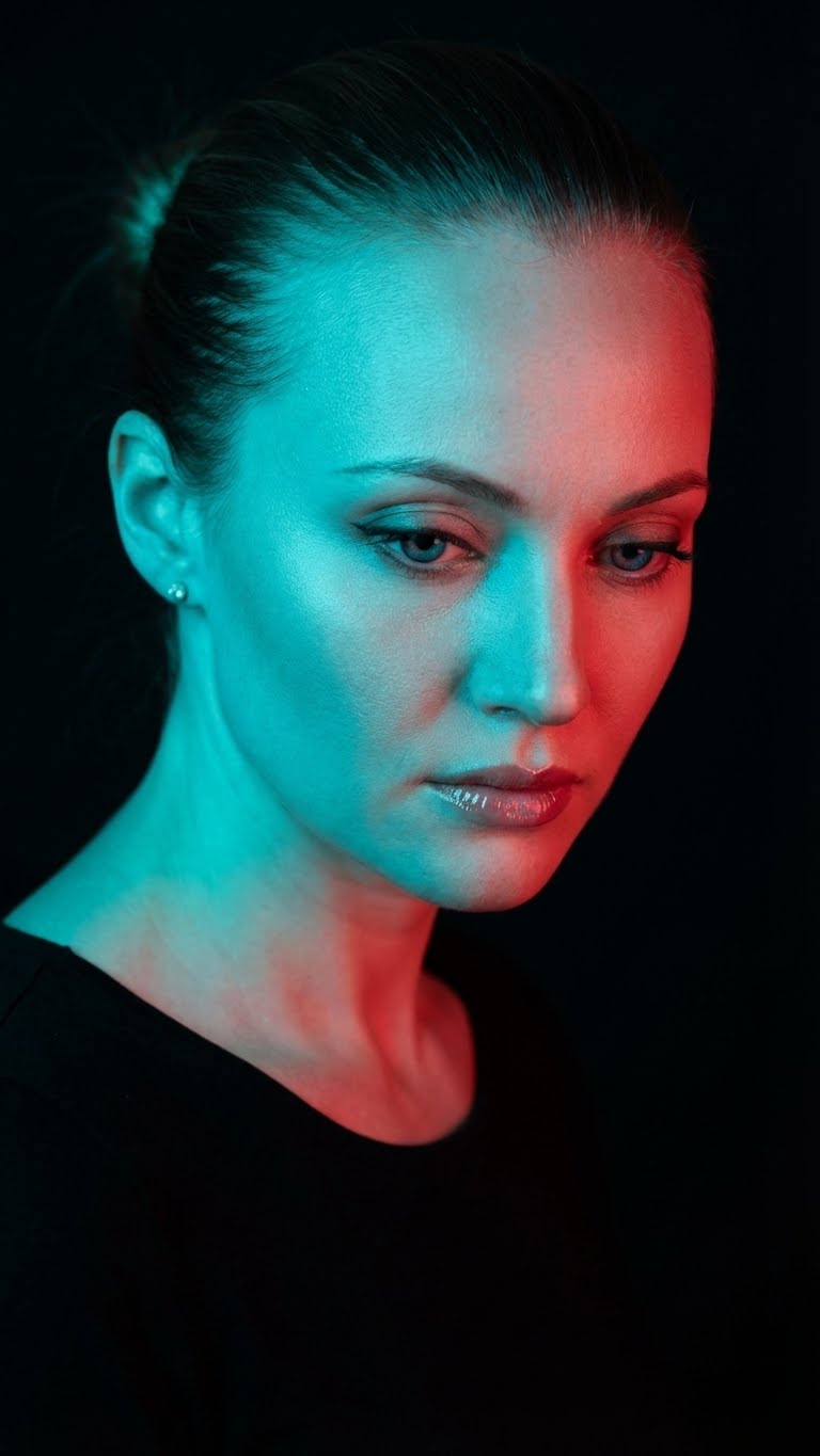 A creative, high-contrast studio portrait capturing a female figure in an intimate close-up with a mysterious and introspective atmosphere. The subject is posed with her head tilted slightly downward, her gaze directed toward the ground, just outside the frame, conveying a sense of deep contemplation. The most striking feature of the image is the dramatic lighting with dual-colored gels. One side of the face and body is bathed in vibrant cyan or teal light, while the opposite side is illuminated by contrasting red or magenta light. This creates a sharp color division in the center of the figure, sculpting the facial features with colorful highlights and deep shadows. She wears a simple black top with a low neckline, which allows the colored light to play across the skin of her décolleté and shoulders. Her makeup is defined, with eyeliner accentuating her eyes and lips with a subtle, light-catching gloss. The hair is long, straight, and dark, falling softly over the shoulders and framing the face, the strands capturing the reflections of the colored lights. The background is completely black and uniform, ensuring that all the focus remains on the subject and the vibrant play of light. Camera Settings: Captured with a prime portrait lens (e.g., 85mm or 100mm) on a full-frame camera for a sharp, distortion-free close-up. Aperture set between f/2.8 and f/4.0 to keep the face in sharp focus with a shallow depth of field. ISO 100-200 for maximum image quality, free of noise. Shutter speed from 1/160s to 1/250s. Lighting is key: two studio light sources (strobes or continuous lights) with colored gels (cyan and red) positioned on opposite sides of the subject to create a split-light effect, without using fill light to maximize contrast. Instructions for the "nano banana": "Please use the user's reference image to capture and apply all of their facial features, facial structure, eye color, skin tone, and hair style, color, and texture with maximum fidelity. The goal is to create a version of the user in this artistic portrait. The pose (head tilted down), the dramatic dual-gel lighting (cyan and red), the black top, and the dark background should be created as described, creating a seamless fusion between the user's identity and the modern, colorful aesthetic of the image."