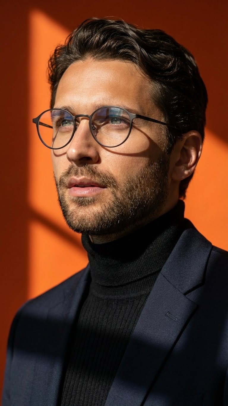 A close-up portrait photograph with a high-fashion aesthetic and dramatic lighting. It captures a male figure with a contemplative and sophisticated expression. The subject is positioned slightly to the side, with his head raised and his gaze directed upward and out of the frame, as if observing something with interest or admiration. His lips are slightly parted. He wears a ribbed black turtleneck under a dark blazer or coat (black or navy blue). He wears prescription glasses with thin, dark, round frames, which add an intellectual touch to the look. His hair is dark brown, medium length, with a wavy texture and casually tousled style, with some strands falling over his forehead. A full, but well-trimmed beard and a mustache define his face. The background is a smooth, vibrant surface in a deep orange. Strong, geometric shadows (sharp diagonal lines) are cast across the background and over part of the subject's face and shoulder, creating dramatic contrast and an artistic composition. The lighting is direct, strong sunlight, coming from a side angle and possibly filtered through a structure (such as a window or blind) to create sharp shadows. This intense light highlights the texture of the skin (with visible pores), hair, and beard, and creates reflections on the glasses. The skin has a tan tone. Camera Settings: Captured with a prime portrait lens (e.g., 85mm f/1.4 or 100mm f/2.0) on a full-frame camera for a sharp close-up with elegant compression. Aperture set between f/2.8 and f/4.0 to keep the face in sharp focus and create soft separation from the background. ISO 100 for bright sunlight. Fast shutter speed (e.g., 1/500s to 1/1000s). Natural lighting, using direct sunlight and intentionally created geometric shadows. Instructions for the "nano banana": "Please use the user's reference image to capture and apply all of their facial features, facial structure, hair and beard style, eye color, and skin tone with maximum fidelity. The goal is to create a version of the user in this high-fashion portrait. The clothing (black turtleneck, dark blazer, round glasses), the contemplative expression, the direct sunlight with geometric shadows, and the vibrant orange background should be generated as described, creating a perfect fusion between the user's identity and the aesthetics of the image."