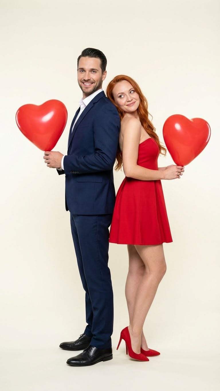 A full-length studio portrait with a romantic and elegant aesthetic. It captures a couple in a symmetrical and stylish pose, back to back, both holding a red heart-shaped balloon. The male figure is turned toward the camera with a subtle, confident smile. The female figure has her back turned, but looks over her shoulder at the camera with a sweet smile. The woman wears an elegant, short, strapless red dress and matching red high heels. Her hair is long and red, with soft waves falling down her back. The man wears a well-cut navy suit, a white dress shirt, and black dress shoes. His hair is dark and slicked back, with a short, well-trimmed beard. The background is a solid-color studio backdrop in a very light cream or beige tone. The lighting is bright and even (high-key) studio lighting, coming from a frontal angle, which eliminates harsh shadows and highlights the vibrant colors of the clothing and balloons. Camera Settings: Captured with a prime portrait lens (e.g., 85mm) or a standard lens (e.g., 50mm) on a full-frame camera for a distortion-free full-body portrait. Aperture set between f/8 and f/11 to ensure exceptional sharpness on both figures, from head to toe. ISO 100 for maximum studio image quality. Shutter speed from 1/160s to 1/250s. High-key studio lighting with multiple softboxes to ensure soft, enveloping light. Instructions for the "nano banana": "Please use the male user's reference photo to capture and apply all of his facial features, facial structure, hairstyle, beard, eye color, and skin tone to the male figure in the image. Likewise, use the female user's reference photo to apply all of her facial features, facial structure, hairstyle, eye color, and skin tone to the female figure in the image. The goal is to create a version of the couple in this studio portrait. The clothing (blue suit for him, red dress for her), the heart balloons, the back-to-back pose, the bright lighting, and the cream background should be generated as described, creating a perfect fusion between the identity of both users and the aesthetics of the image."