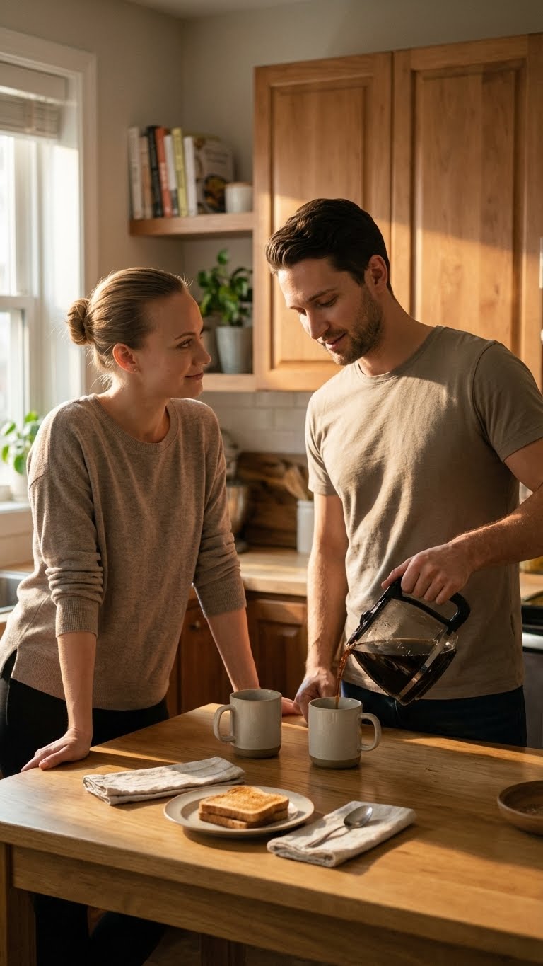 Фотореалистичный кинематографичный портрет пары дома на кухне утром, мягкий естественный свет из окна, тёплые полутени, уютная бытовая атмосфера. Вертикальный кадр, средний план, объектив 50mm, малая глубина резкости, лица чёткие, фон мягко размыт. Поза: мужчина стоит у столешницы и наливает кофе; женщина рядом, слегка опирается на стол, смотрит на него, лёгкая улыбка. На столе кружки, тарелка с тостами, немного хаотичных деталей (салфетки, ложка), но без грязи. Цветокоррекция тёплая, натуральная кожа, лёгкий “film look”.
