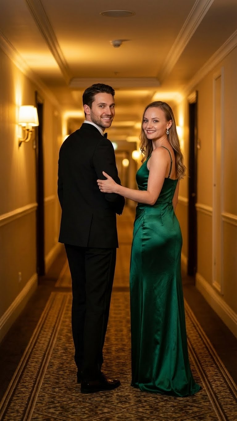 Коридор в отеле, вечерний дресс-код — промпт для Nano Banana | Нейро.PRO | Нейро.PRO