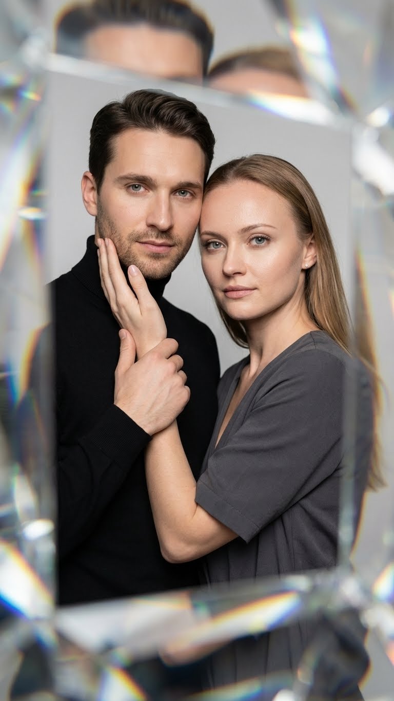 Креативный портрет пары: часть кадра снята через призму/выпуклое стекло, по краям радужные “осколки”, центр чистый и резкий. Вертикальный кадр 4:5, 85mm, малая глубина резкости, лица сверхчёткие, кожа натуральная.