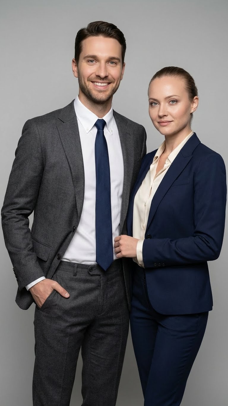 Профессиональный студийный портрет пары как “основатели проекта”: нейтральный фон (серый), мягкий трёхточечный свет, аккуратный контраст, натуральная ретушь без пластика. Вертикальный кадр 4:5, 85mm, лица максимально резкие.