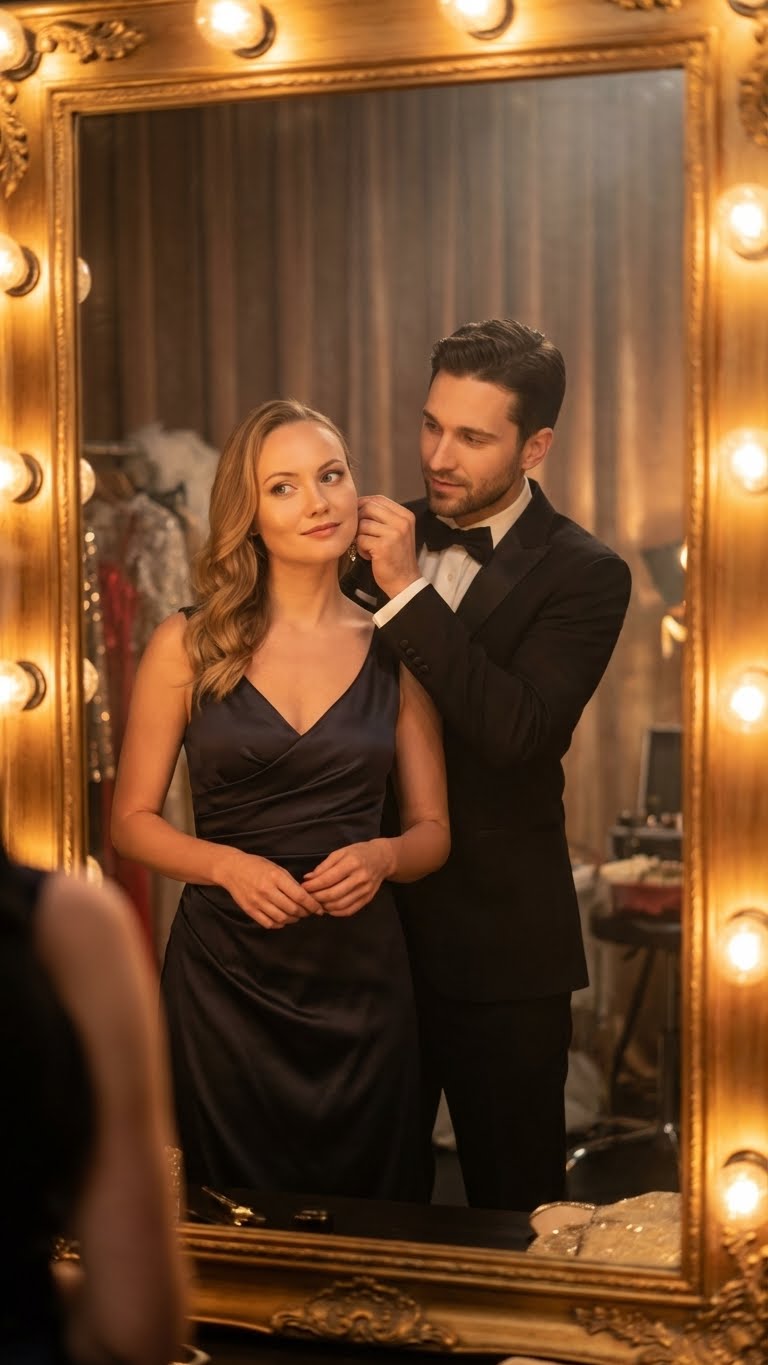 Действие: женщина стоит у зеркала, мужчина позади поправляет ей серьгу/заколку; затем оба смотрят в отражение (не прямо в камеру), будто готовятся выйти на сцену.