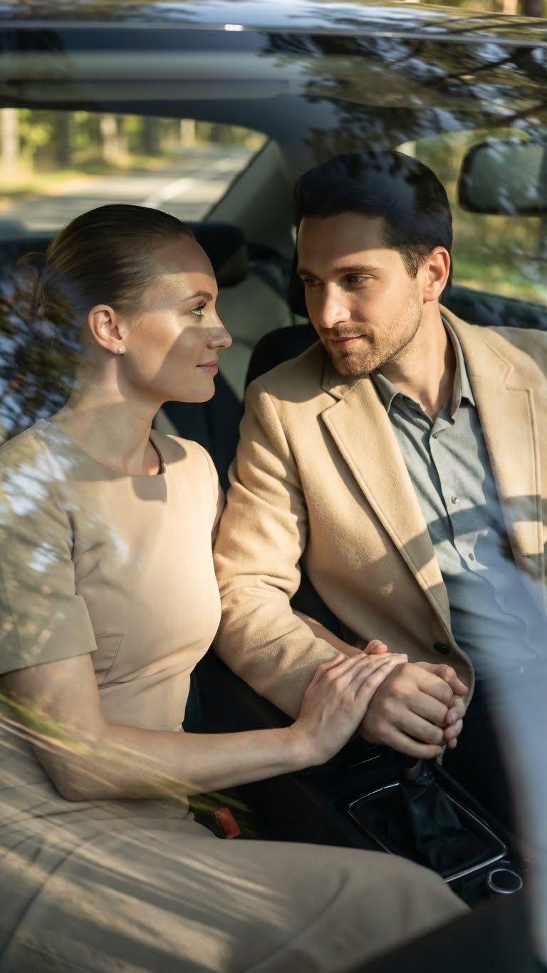 Поза: женщина сидит ближе к окну, мужчина ближе к центру, их руки соединены на рычаге/подлокотнике; взгляд между ними, затем в камеру.