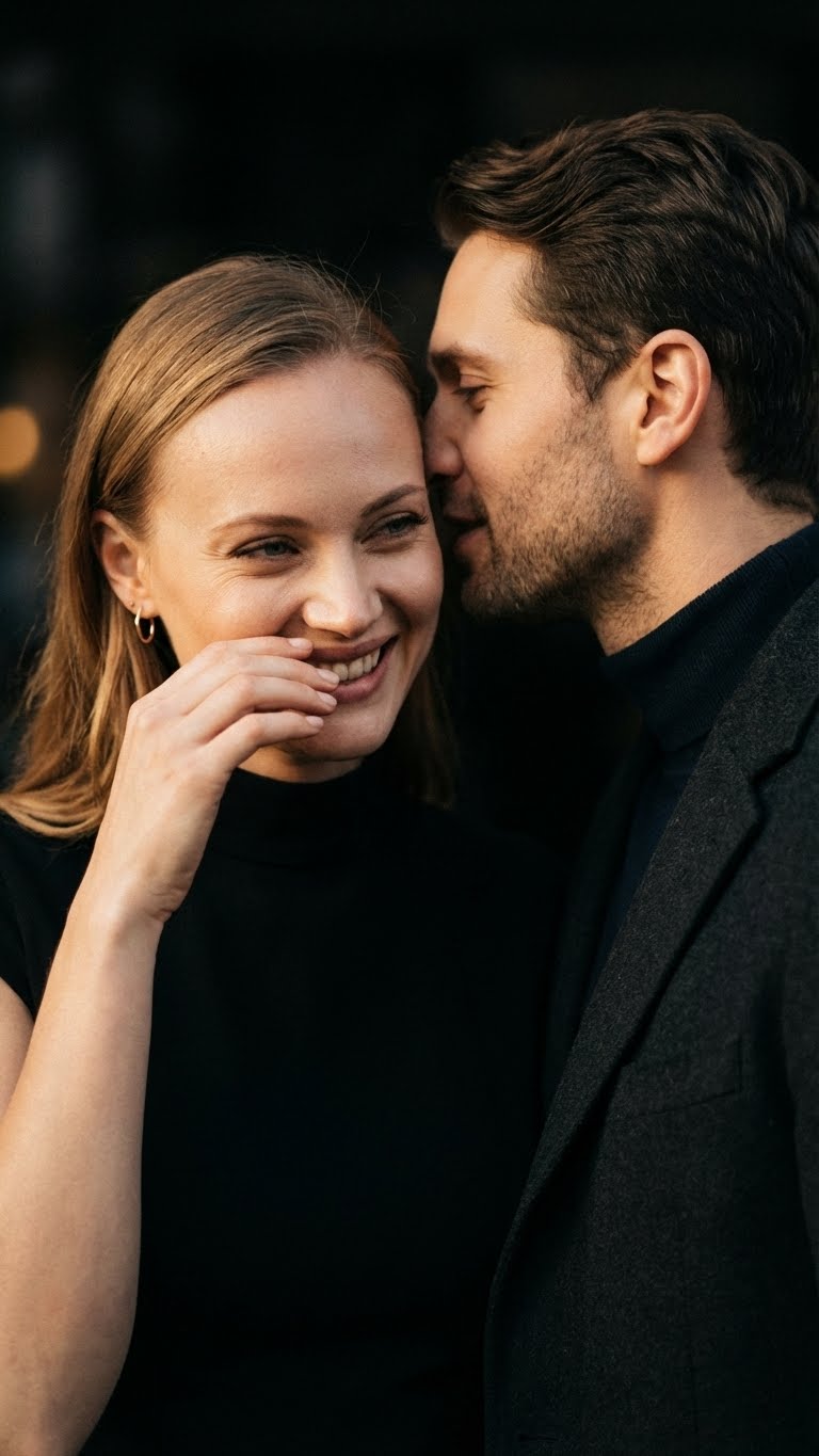 Мужчина шепчет женщине на ухо, женщина пытается сдержать смех — промпт для Nano Banana | Нейро.PRO | Нейро.PRO