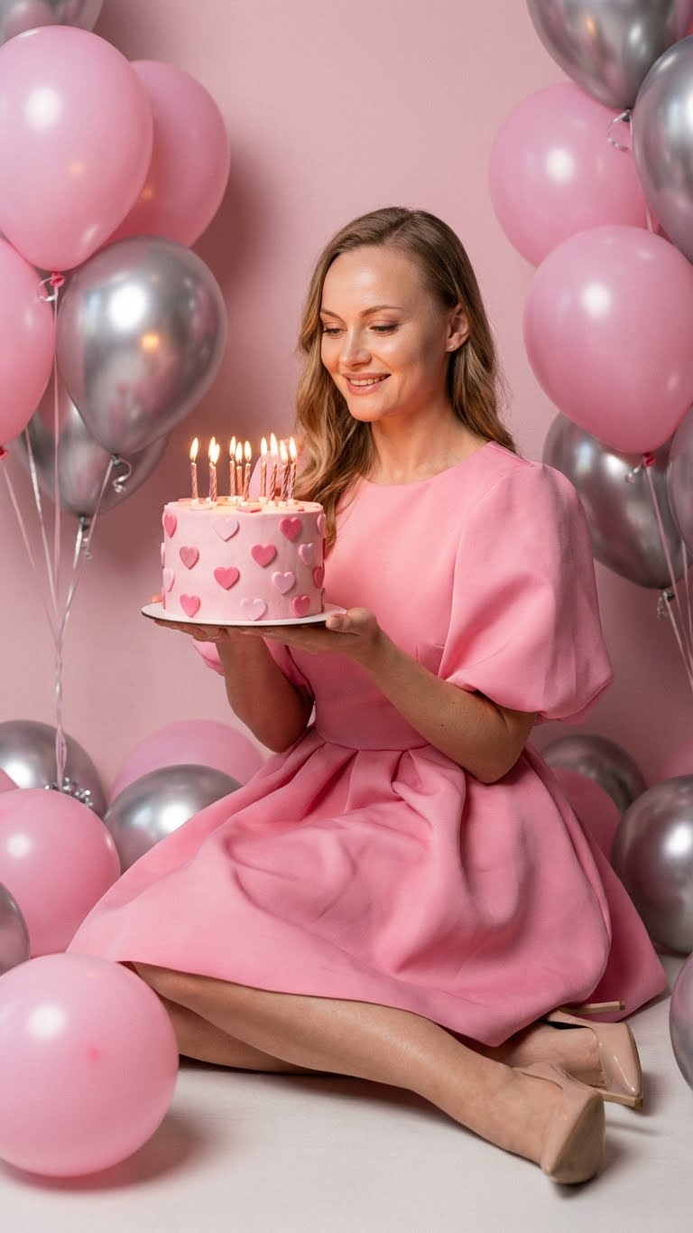 Человек сидит на полу в окружении розовых и серебристых воздушных шаров. Держит милый торт с сердечками и зажжёнными свечами. Смотрит на торт с улыбкой. Розовое структурированное платье с объёмом и женственным силуэтом. Розовые или нюдовые туфли на каблуке. Розовый фон. Счастливая нежная атмосфера праздника. Мягкий студийный свет. Реалистичное свечение от свечей. Высокая детализация кожи, ткани платья и текстуры торта.