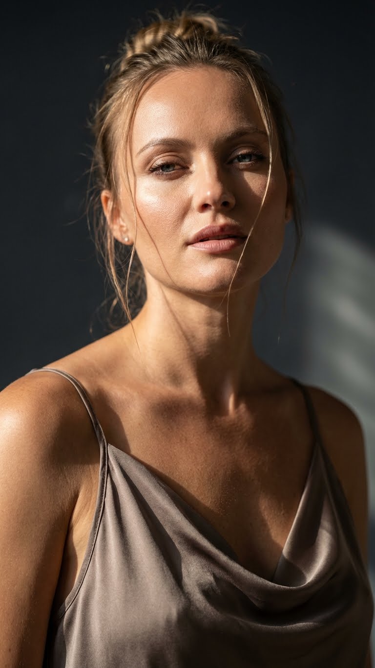 Кинематографичный гиперреалистичный крупный портрет, 8K, как Vogue-кадр. Лицо строго как у загруженного человека, без изменений, допускается только смена мимики и наклона головы. Модель стоит расслабленно, корпус чуть назад, подбородок приопущен, глаза мягко открыты, губы слегка приоткрыты — спокойная уверенность. На ней струящееся шёлковое платье холодного таупа на тонких бретельках, ткань мягко обтекает тело, в боковом солнечном свете видны живые складки и блеск шёлка. Волосы небрежно собранные, чуть взъерошенные, отдельные пряди детализированы, пряди частично падают к лицу, одна тонкая прядь пересекает щёку. Жёсткий свет сверху-сбоку, рембрандтовский рисунок: ярко освещённая ближняя сторона лица, скулы, нос, лоб; на дальней щеке световой треугольник. Глубокие тени под скулами и подбородком, на шее и ключицах. Кожа тёплой бронзы, естественная текстура. Фон — графитовая стена в боке с солнечными полосами. Палитра: графит, тауп, бронза. Камера: Sony A7R V, 85mm f/1.8. Negative: изменение лица, пластиковая кожа, артефакты, текст, пересветы