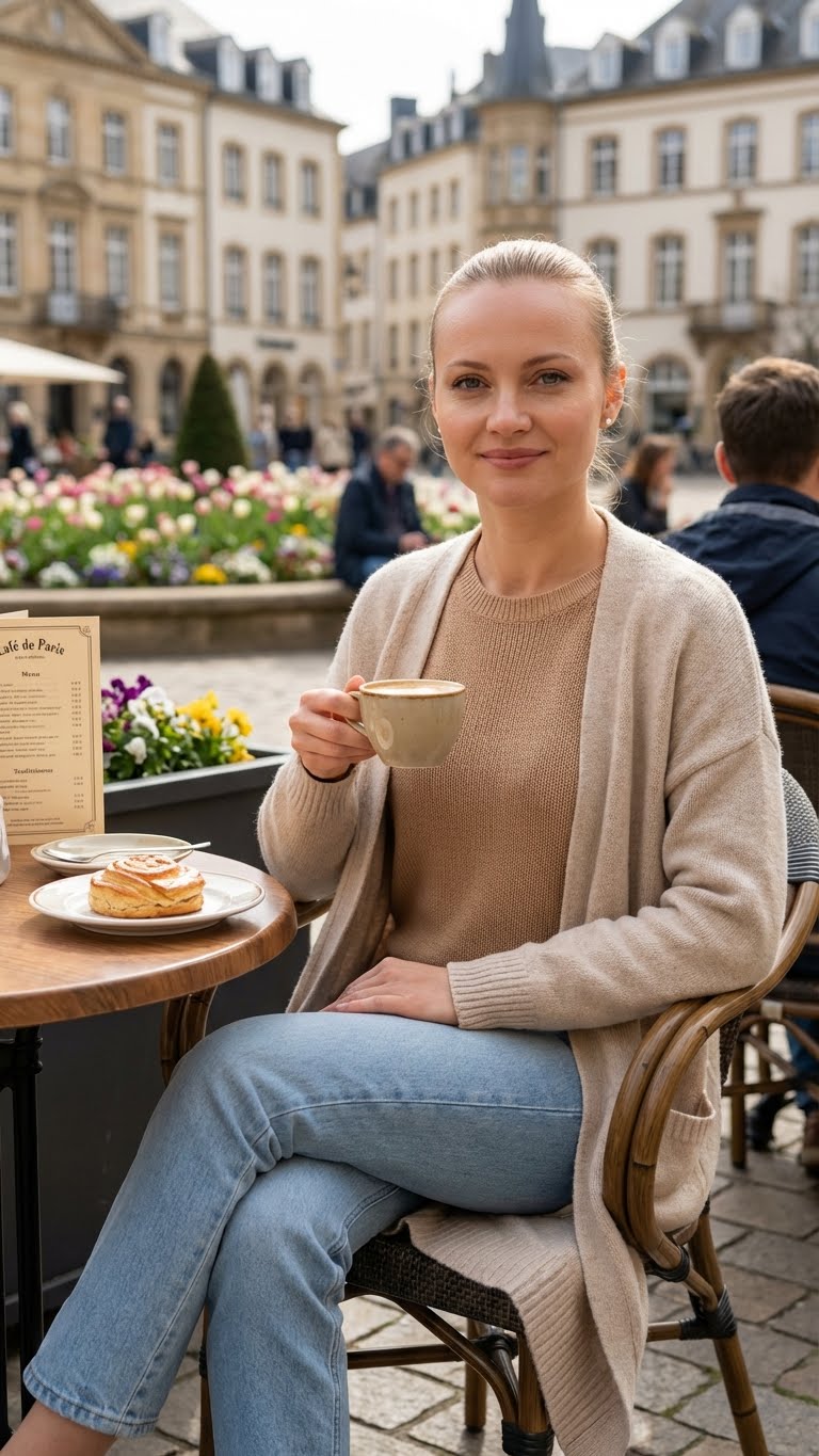 Не меняй черты лица девушки с референса. Крупный портрет молодой девушки, в длинном светло-бежевом кардигане, под которым надета облегающая трикотажная кофточка тёплого бежевого оттенка, светло-голубые прямые джинсы. Она уютно расположилась на террасе Café de Paris на Place d’Armes, Люксембург. Молодая девушка элегантно держит чашку кофе, на столе аккуратное пирожное на белой тарелке, рядом — меню в традиционном стиле. За её плечом — размытый фон с жизнью площади, историческая архитектура и цветущие клумбы. Весенний свет озаряет лицо девушки, подчёркивая мягкие черты, лёгкую улыбку и атмосферу беззаботного европейского утра. Фотореалистичное изображение, высокая текстурная детализация, высокое качество, разрешение 8К. Формат 9:16.